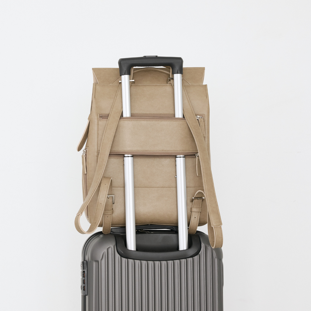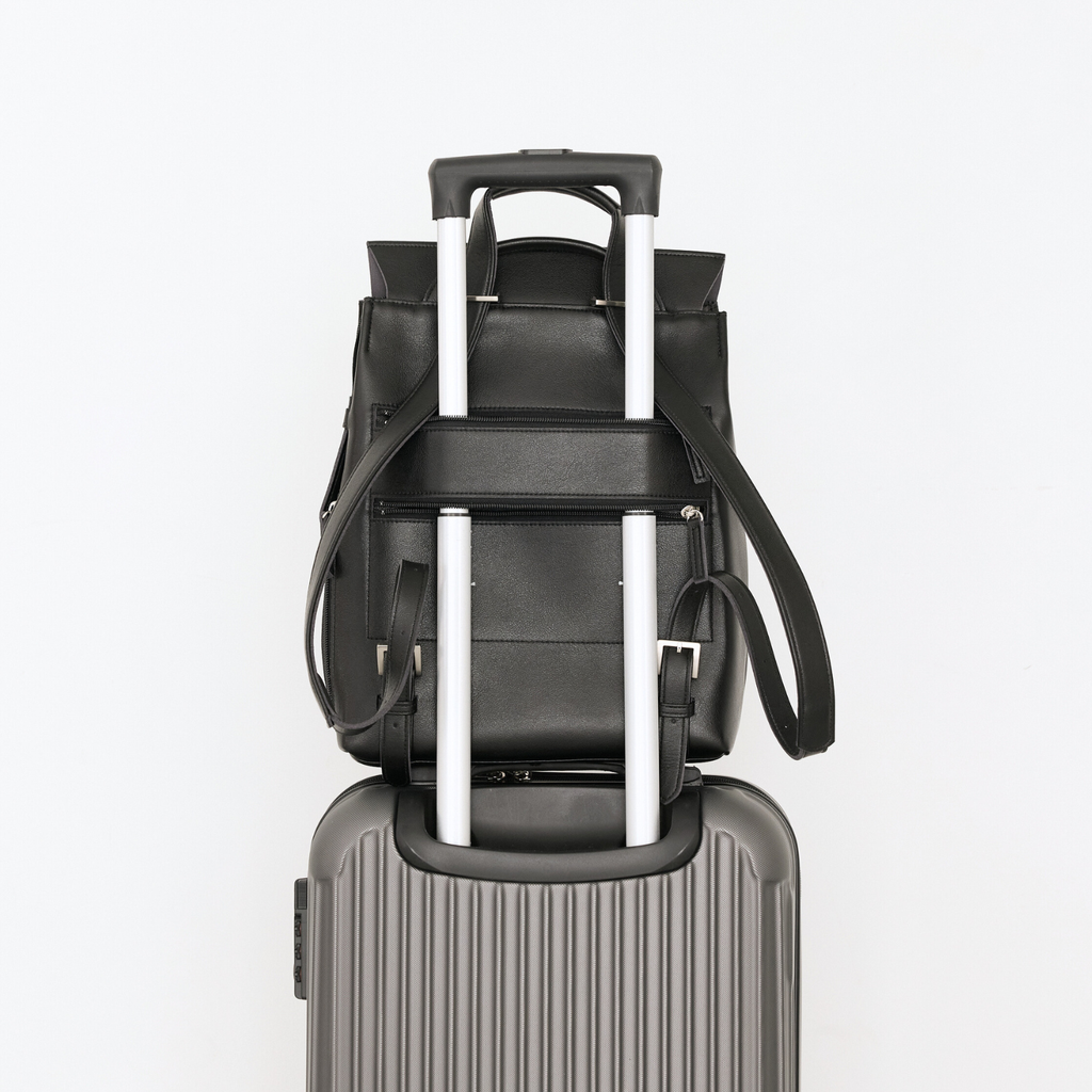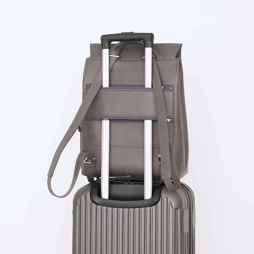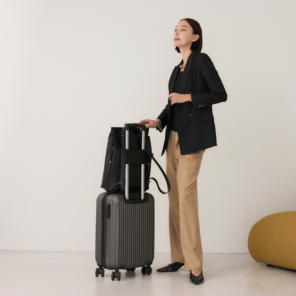 キャリーケースのハンドルに差し込めるため、出張時の移動が劇的にラクになります。