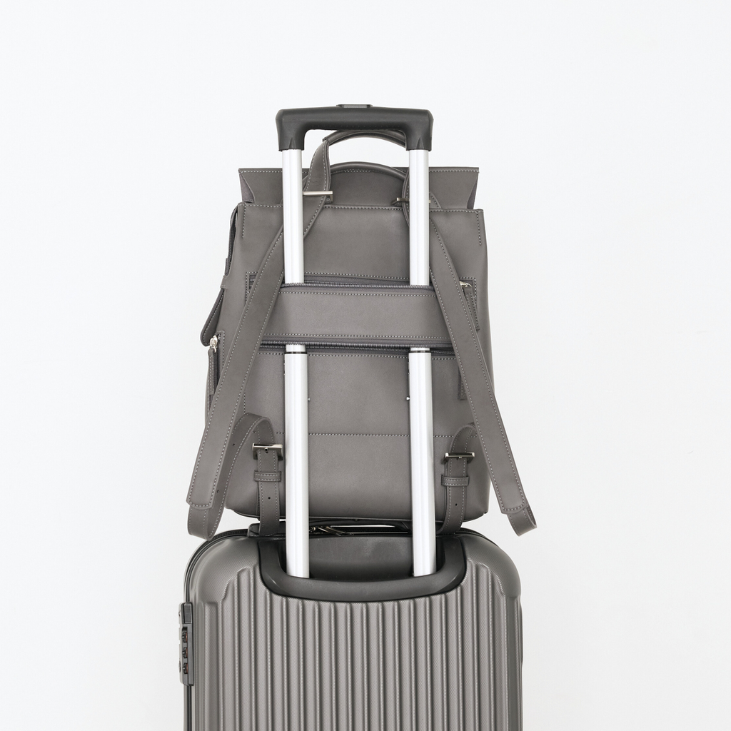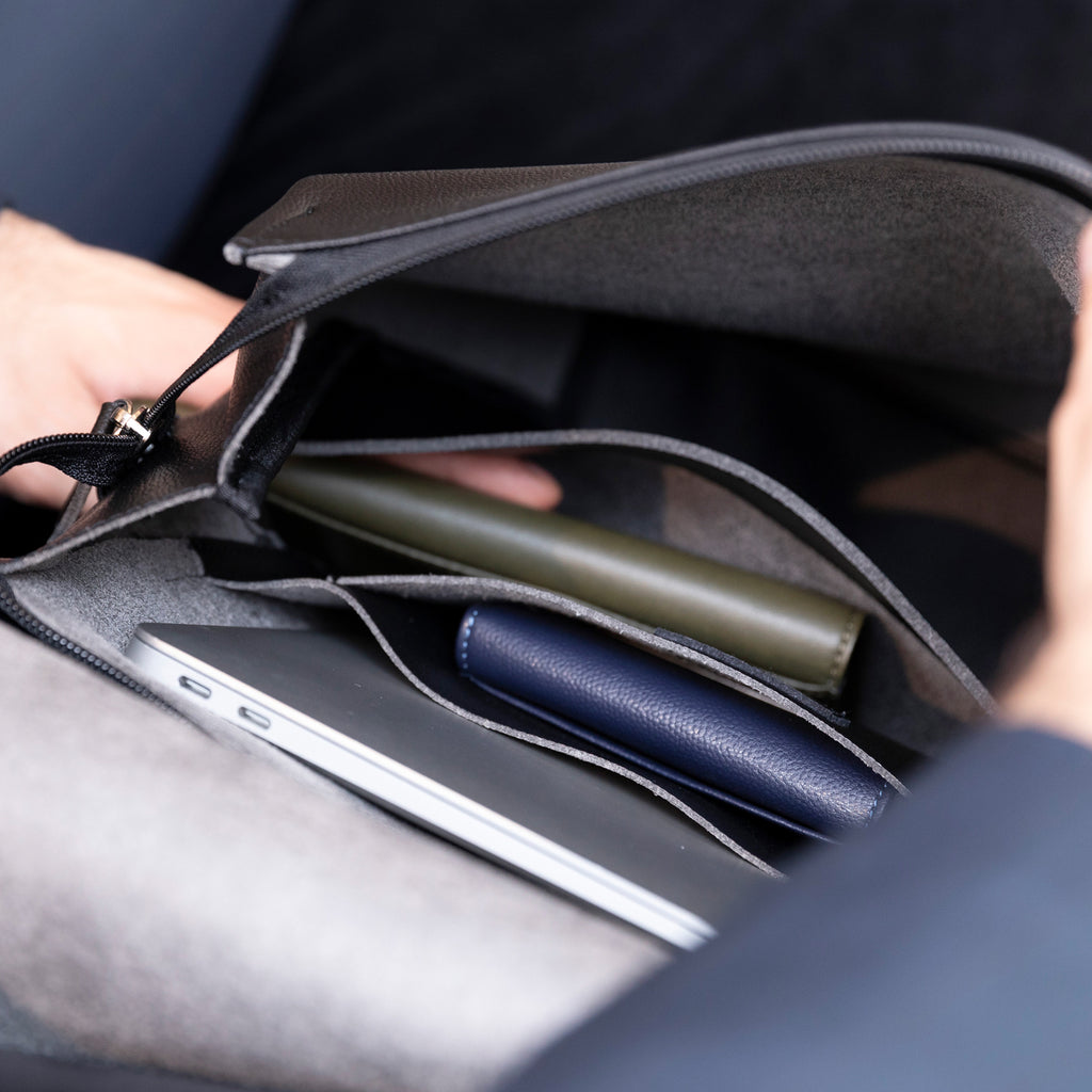 スマホや名刺ケースなど頻繁に出し入れするアイテムは、背面のファスナー付ポケットに収納できます。