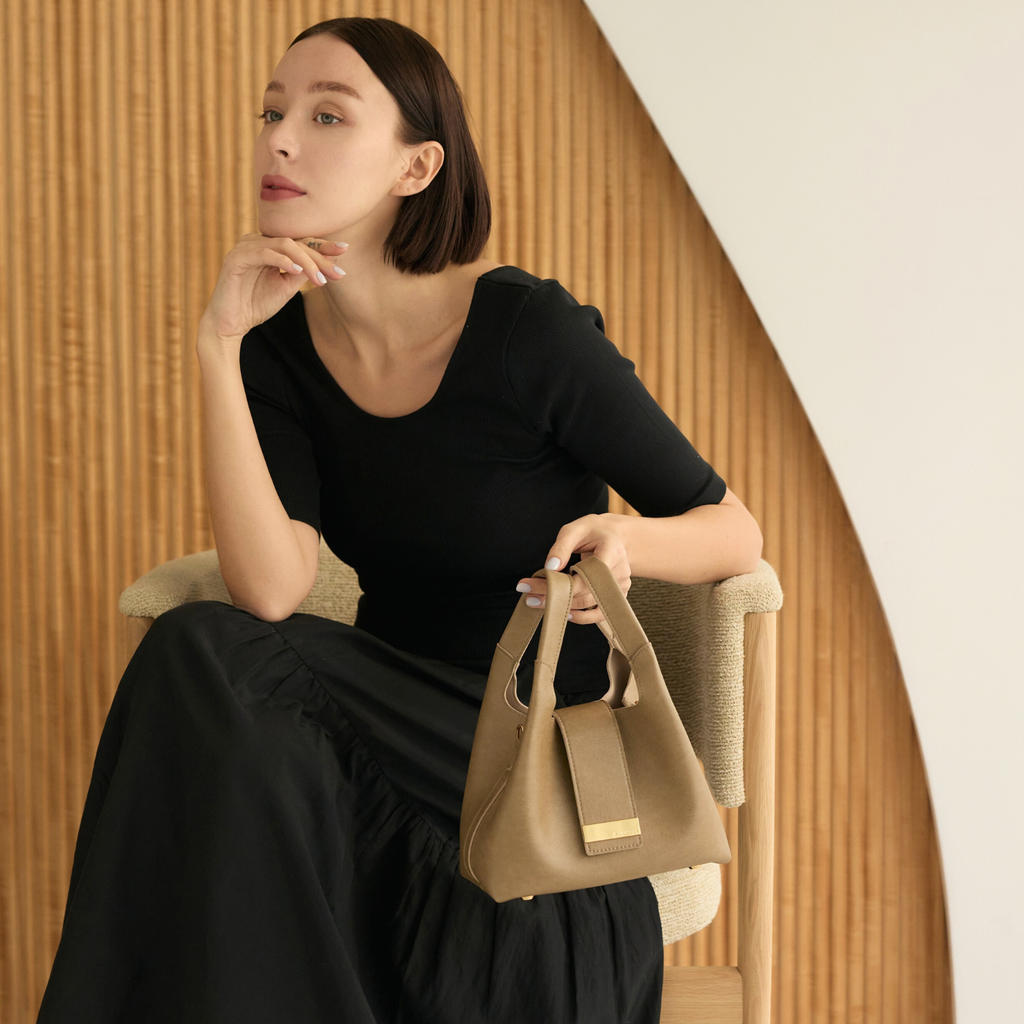 まるみのあるバッグがコーディネートの印象をよりエレガントに。