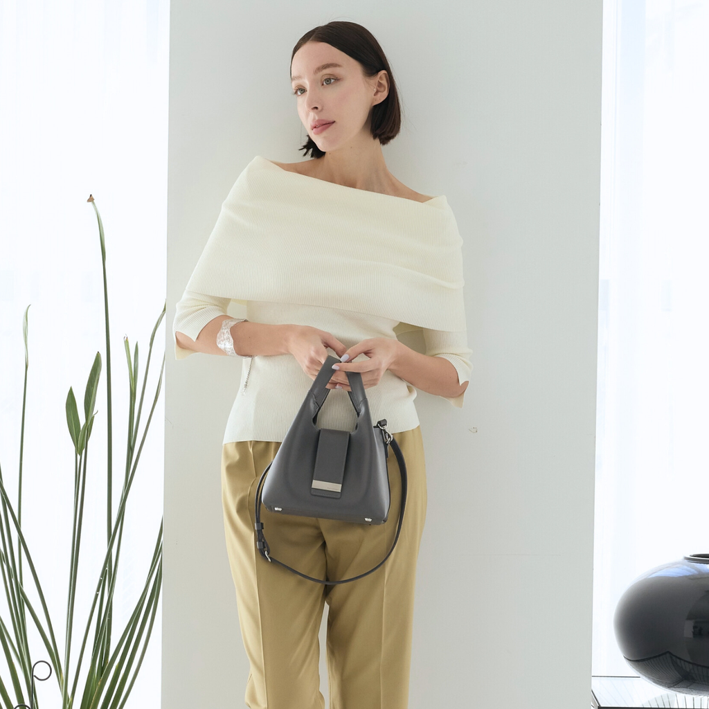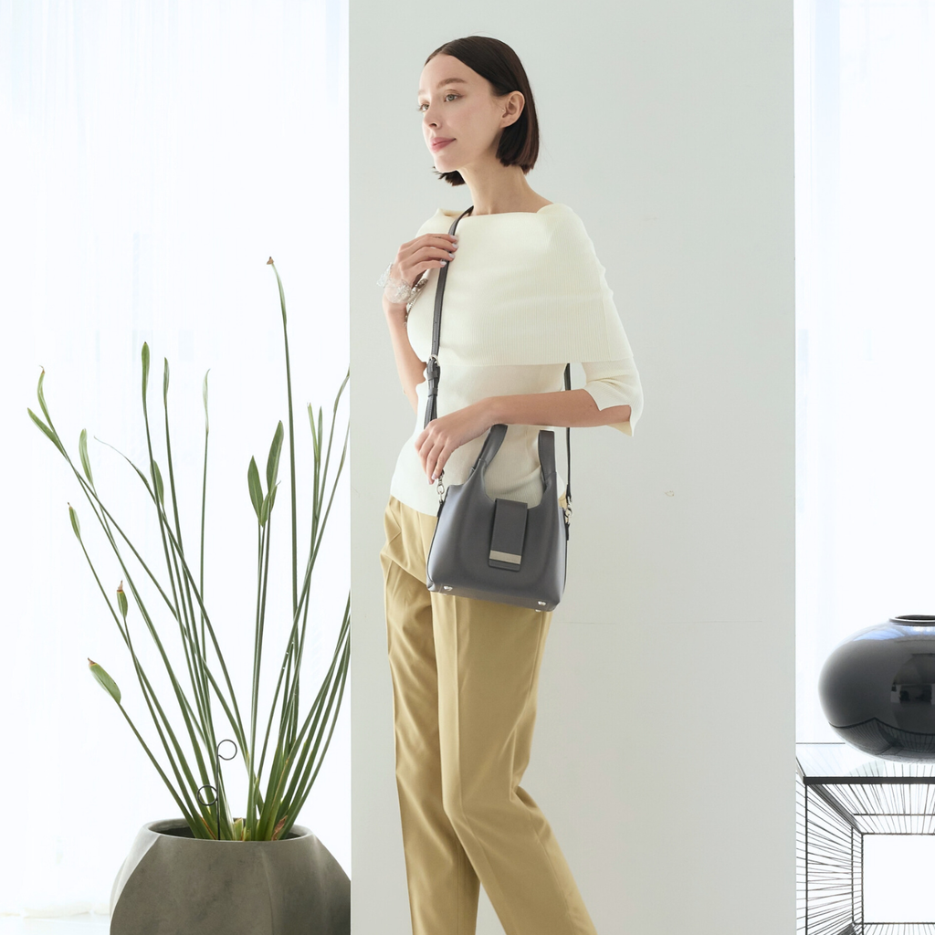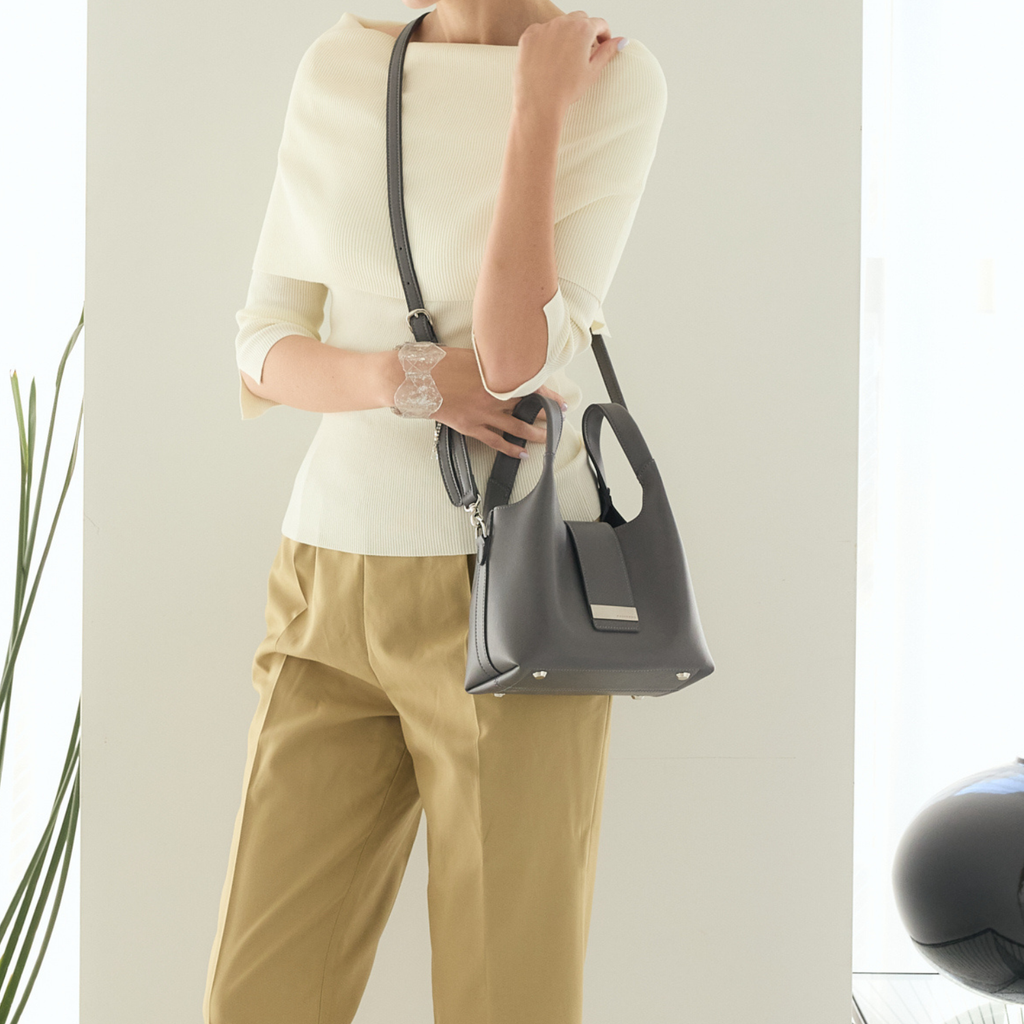まるみのあるバッグがコーディネートの印象をよりエレガントに。