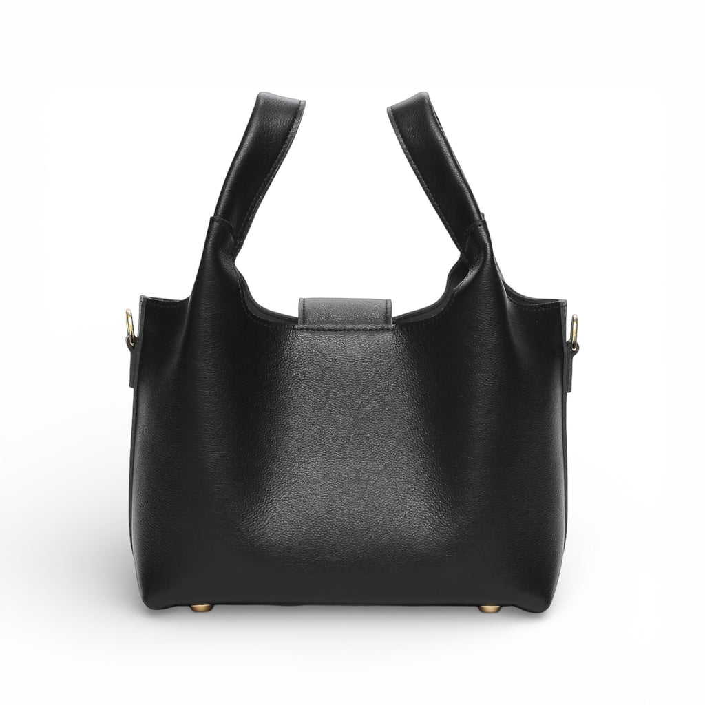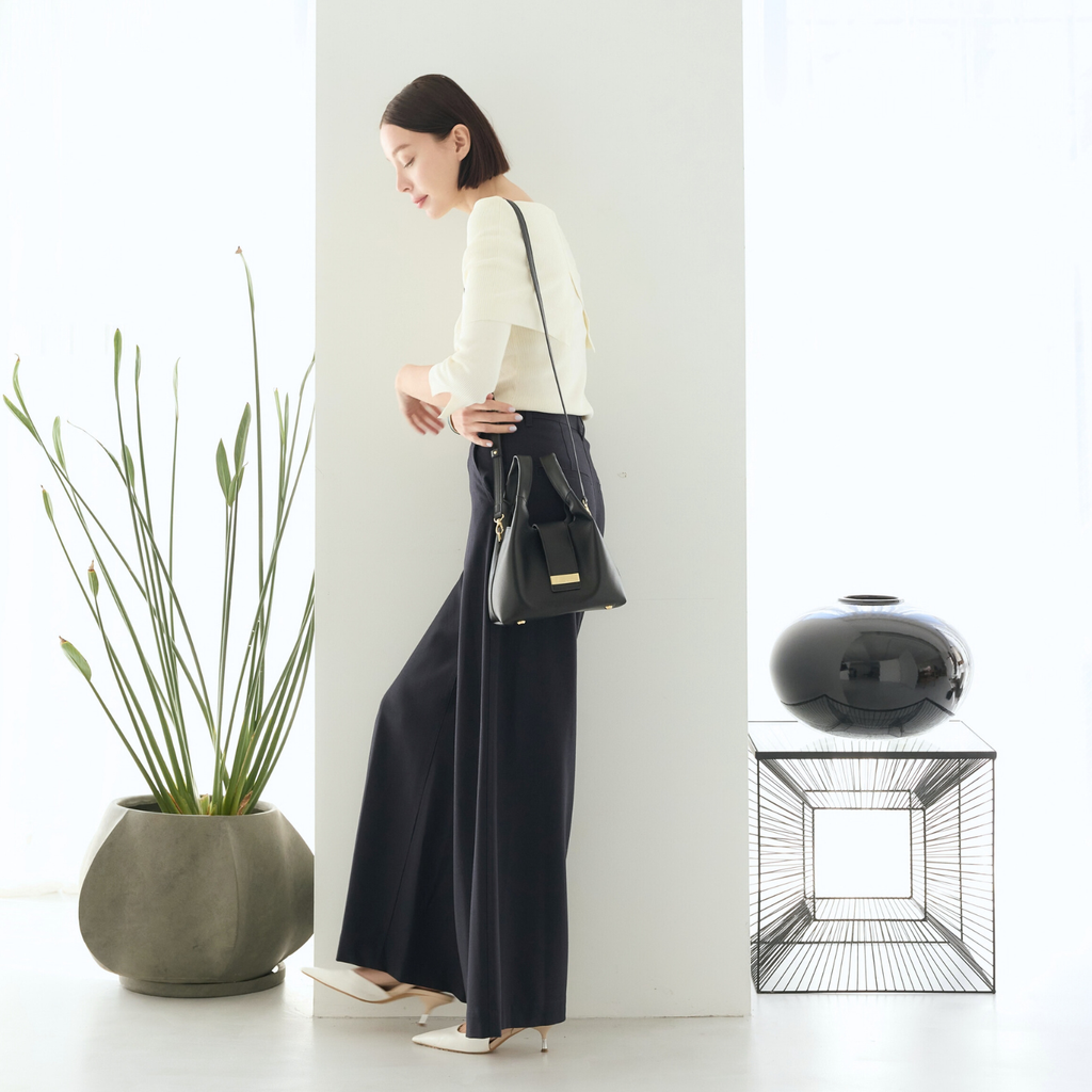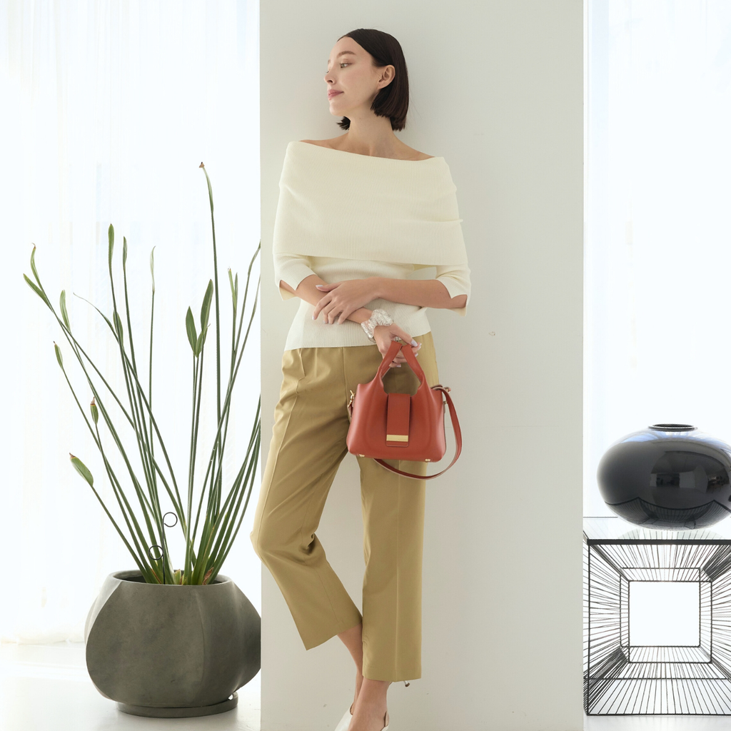 まるみのあるバッグがコーディネートの印象をよりエレガントに。