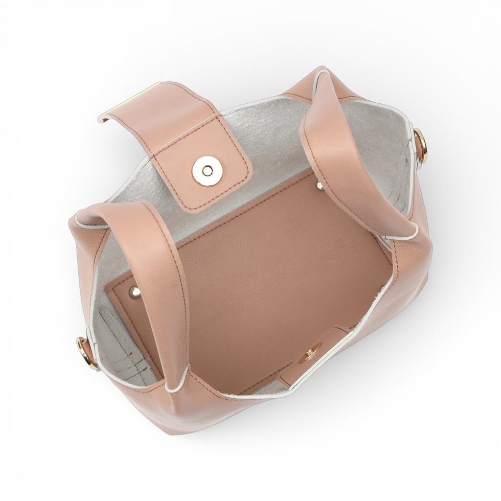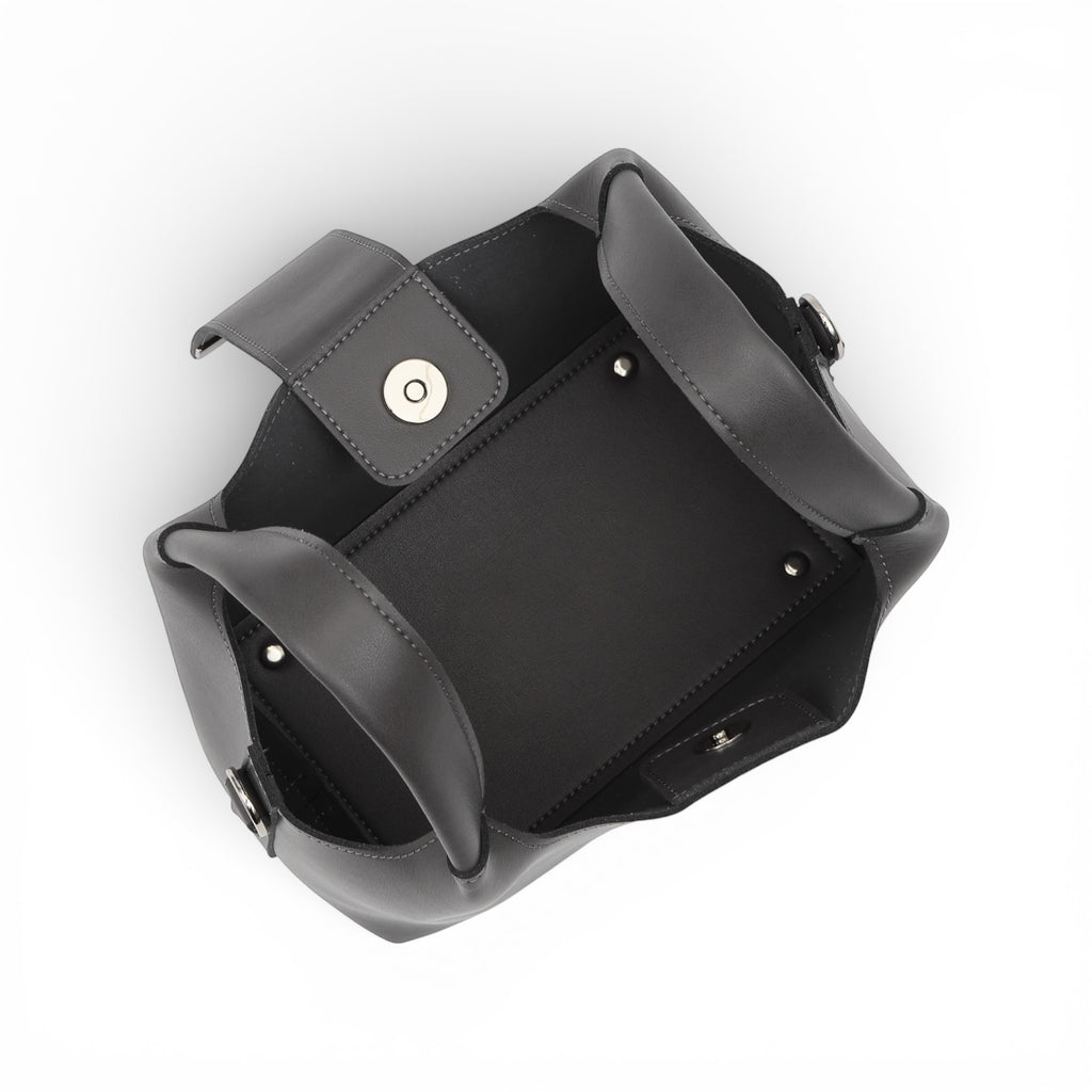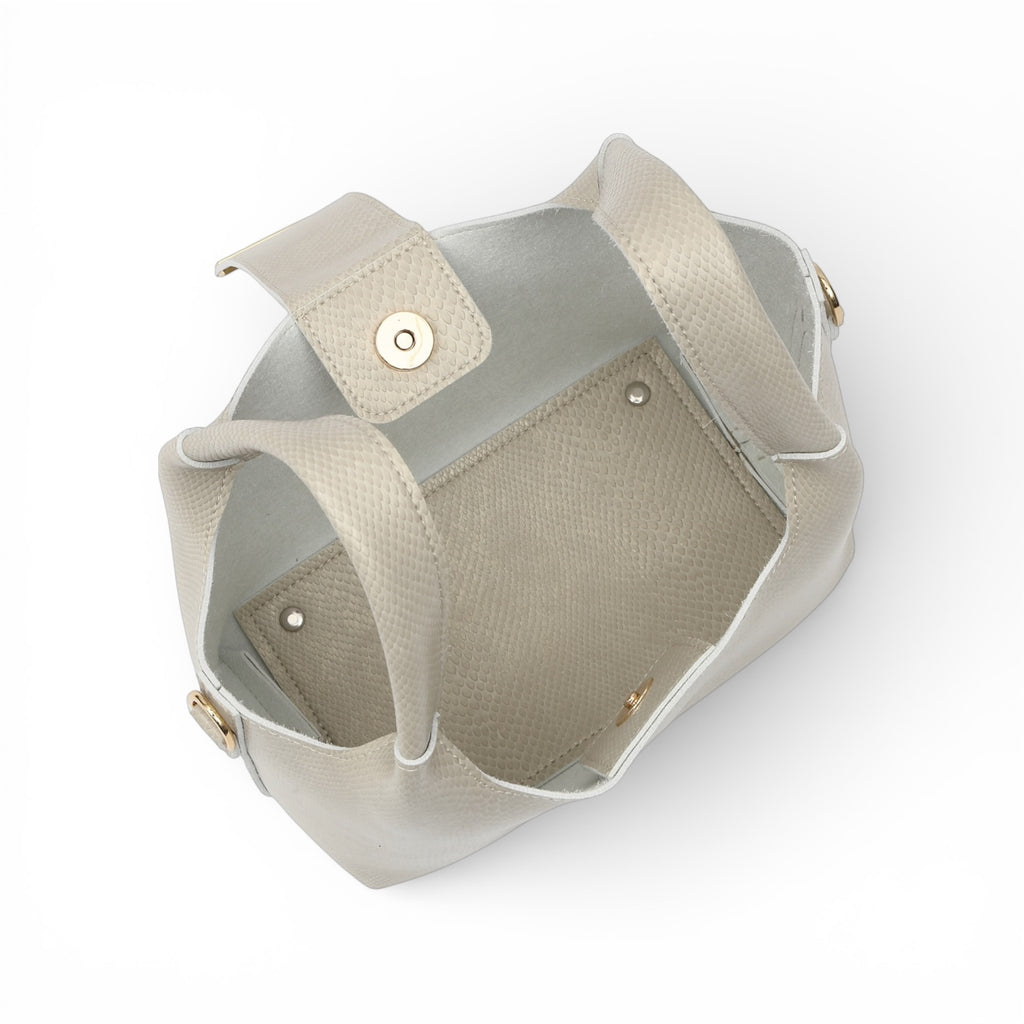 マチが広いバケツ型で、お財布、スマートフォン、コスメポーチ、ウォーターボトルなど、ふだん持ち歩くアイテムがちょうど収納できるサイズです。