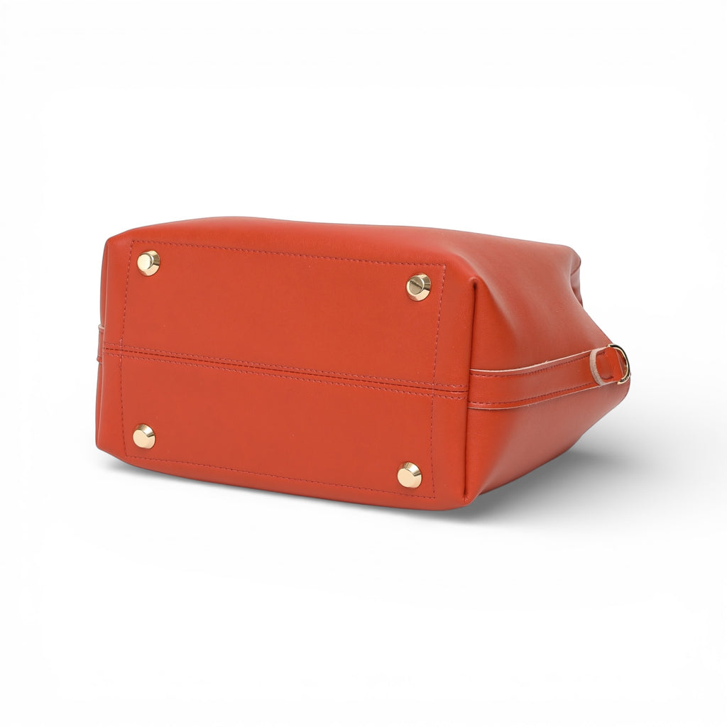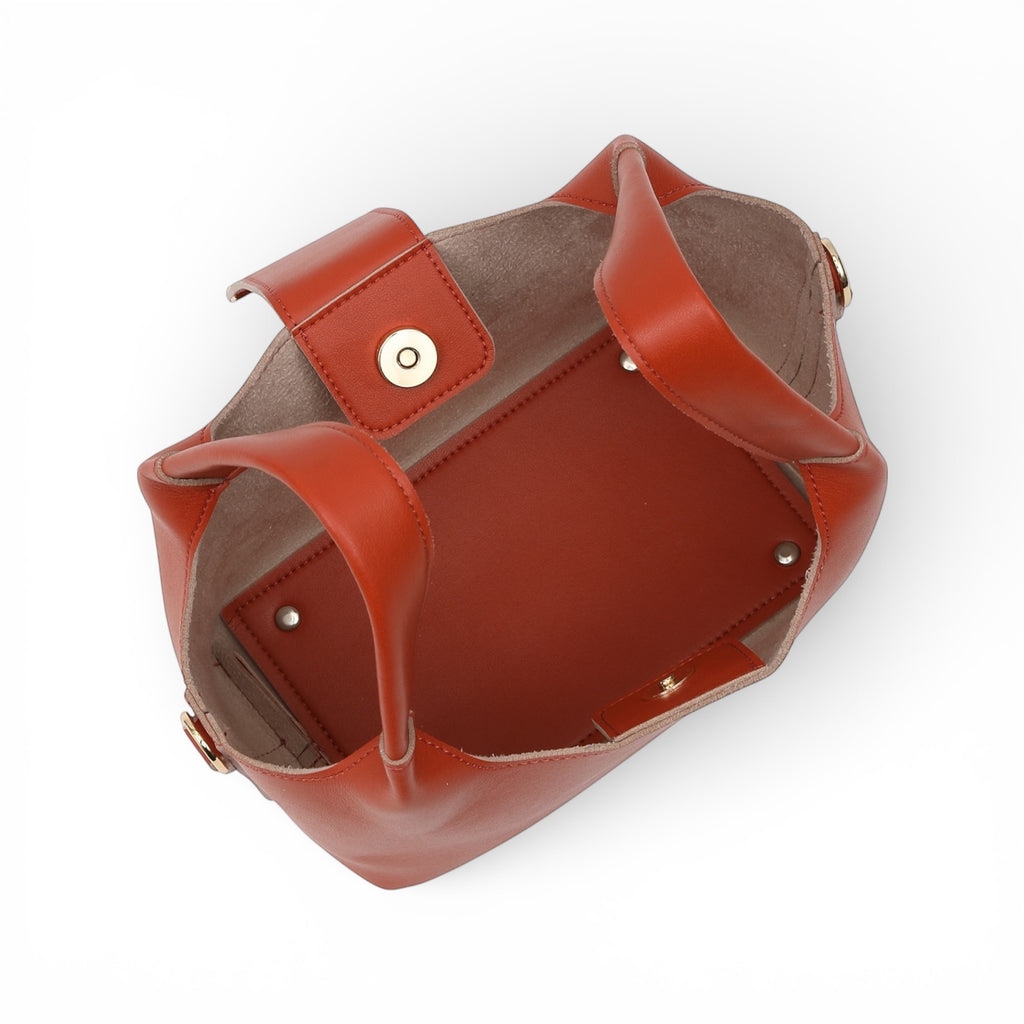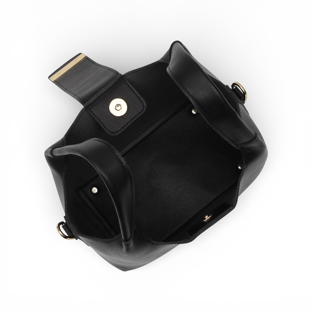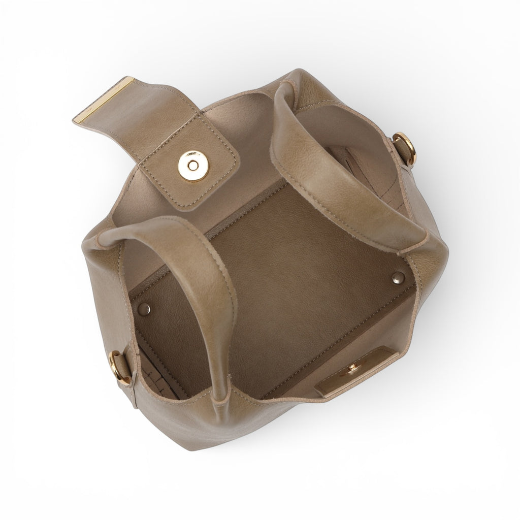 マチが広いバケツ型で、お財布、スマートフォン、コスメポーチ、ウォーターボトルなど、ふだん持ち歩くアイテムがちょうど収納できるサイズです。